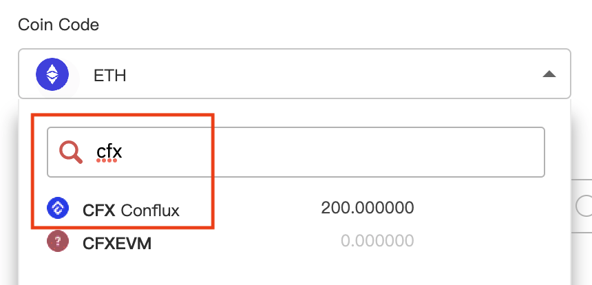 3\. En Retirar, expanda la selección del Código de criptomoneda y busca CFX. Luego haz clic en el resultado.